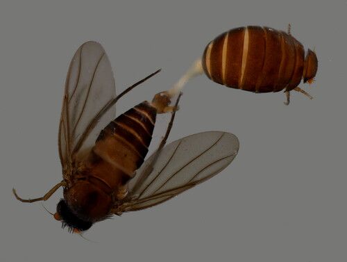 タイのKhao Yaiで仕掛けたFITの収穫物を仕分けしていたら出てきたノミバエの雌雄。最初に翅のないノミバエに気付いて、翅がないのに何でFITに落ちたんだろうと思ったら、雄がお尻にぶらさがっていた。いや、正確には雌のほうがぶら下がっていたことになる。…