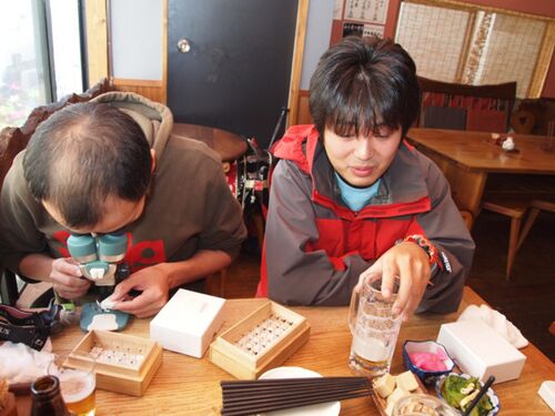 13時から西荻窪の「ささら亭」に集り、知久さんと賢太郎君と飲み始める。知久さんの持ってきたファーブル(携帯顕微鏡)と各自持ち寄ったツノゼミの標本を机に出して、ツノゼミ談義。延々とツノゼミの話しをして、18時前から高円寺の沖縄料理店「きよ香」に…